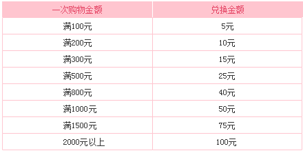 用戶一次購物金額超過100元即可參與積分兌換現(xiàn)金券活動,所得現(xiàn)金券在下次購物時可支付商品金額及配送費,用戶應(yīng)補齊購物費差額部分。