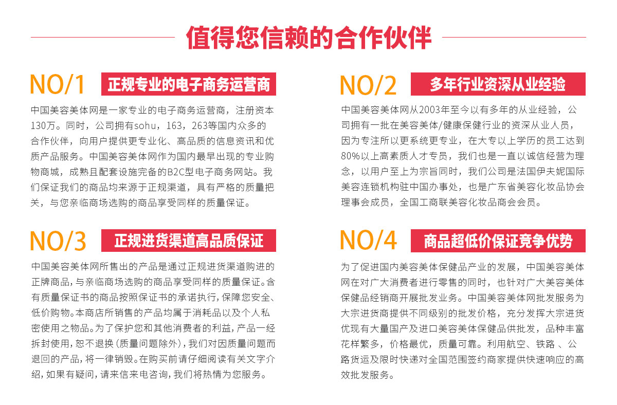 歡迎廣大美容美體保健品經(jīng)銷商與我們進(jìn)行代理批發(fā)業(yè)務(wù)的合作,以獲得豐厚的利潤回報,有意者請與我們聯(lián)系。